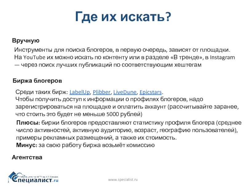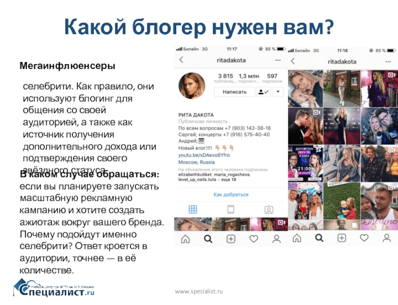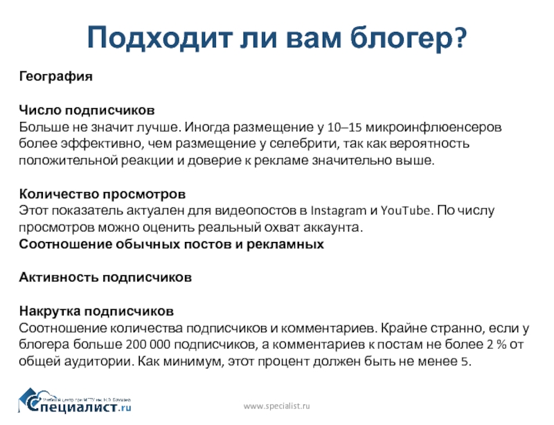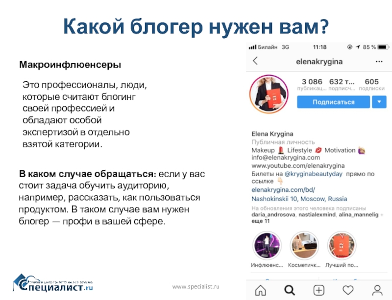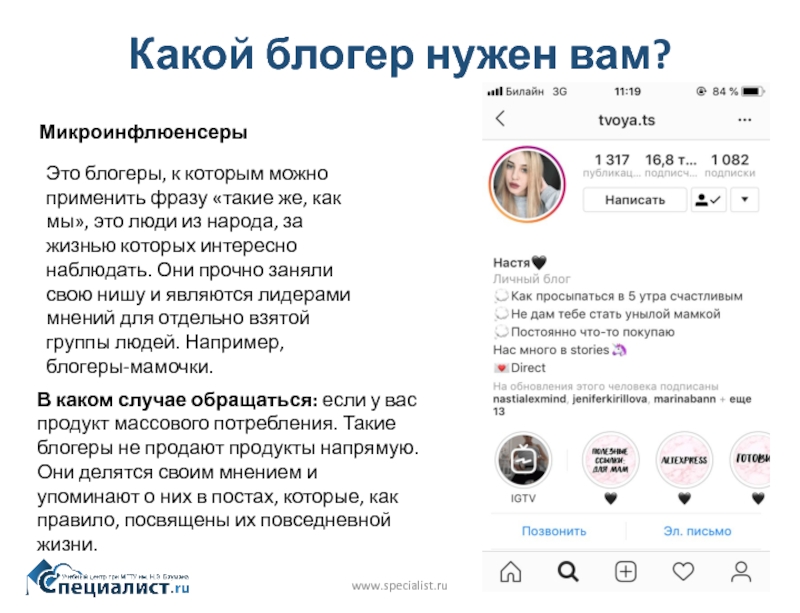 каком случае обращаться: если у вас стоит задача обучить аудиторию, например, рассказать, как пользоваться продуктом. В таком случае вам нужен блогер — профи в вашей сфере.