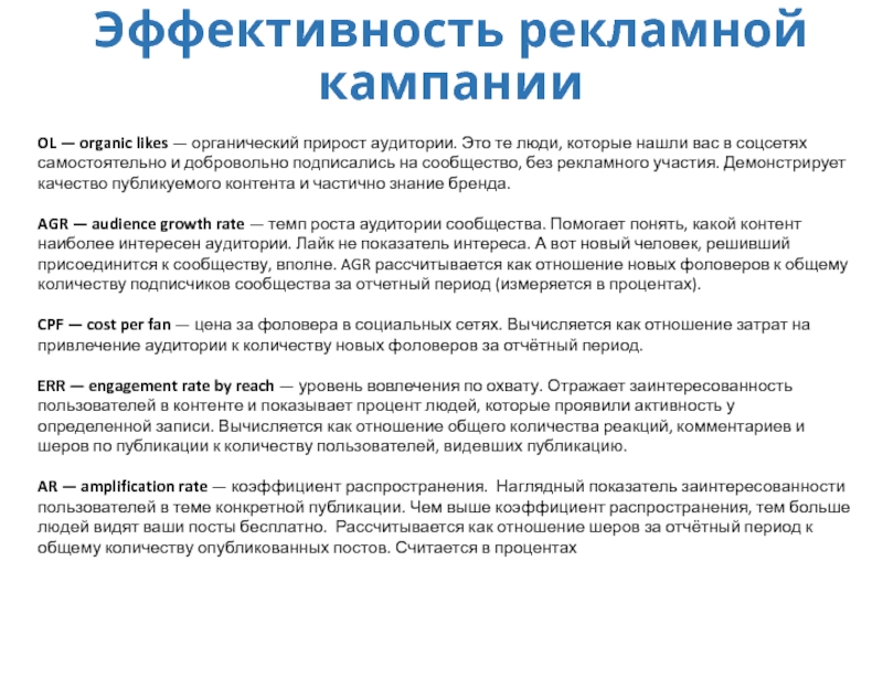 AR — amplification rate — коэффициент распространения. Наглядный показатель заинтересованности пользователей в теме конкретной публикации. Чем выше коэффициент распространения, тем больше людей видят ваши посты бесплатно. Рассчитывается как отношение шеров за отчётный период к общему количеству опубликованных постов. Считается в процентах