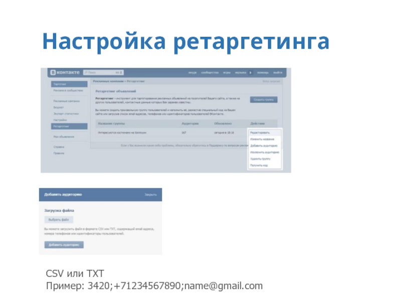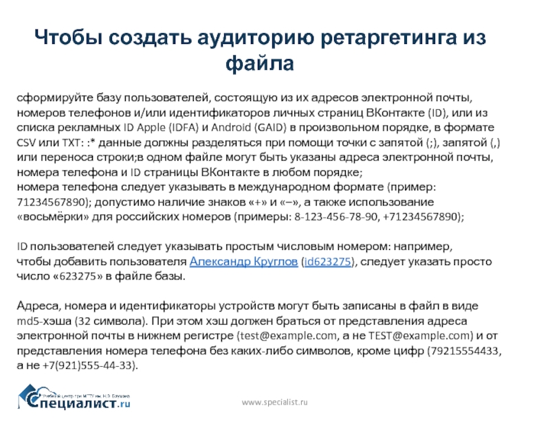 ВКонтакте (ID), или из списка рекламных ID Apple (IDFA) и Android (GAID) в произвольном порядке, в формате CSV или TXT: :* данные должны разделяться при помощи точки с запятой (;), запятой (,) или переноса строки;в одном файле могут быть указаны адреса электронной почты, номера телефона и ID страницы ВКонтакте в любом порядке;