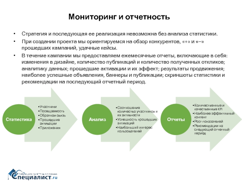 В течение кампании мы предоставляем ежемесячные отчеты, включающие в себя: изменения в дизайне, количество публикаций и количество полученных откликов; аналитику данных; прошедшие активации и их эффект; результаты продвижения; наиболее успешные объявления, баннеры и публикации; скриншоты статистики и рекомендации на последующий отчетный период.