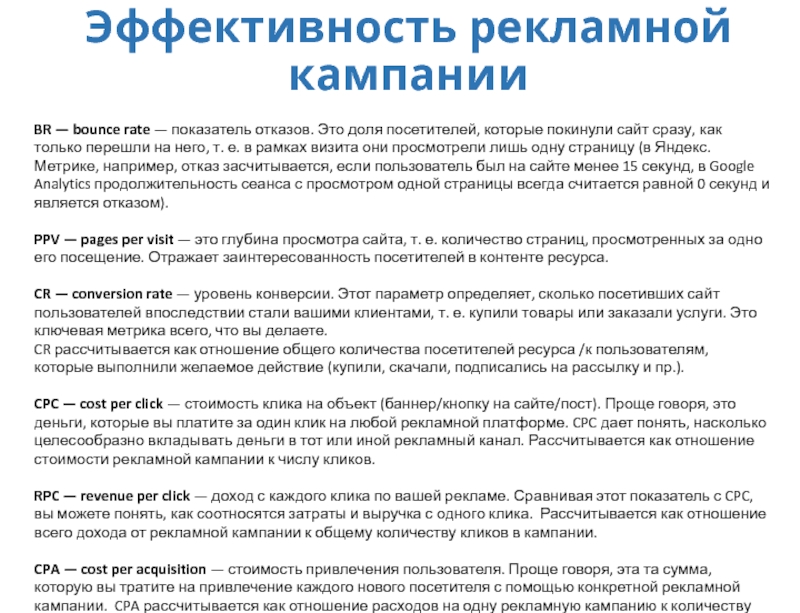 CR — conversion rate — уровень конверсии. Этот параметр определяет, сколько посетивших сайт пользователей впоследствии стали вашими клиентами, т. е. купили товары или заказали услуги. Это ключевая метрика всего, что вы делаете.