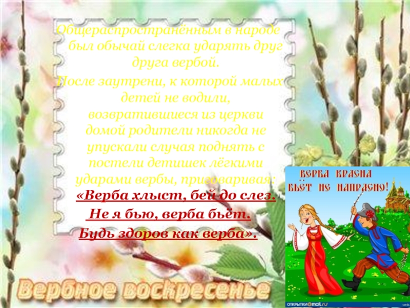 Слайд 8Общераспространённым в народе был обычай слегка ударять друг друга вербой.
