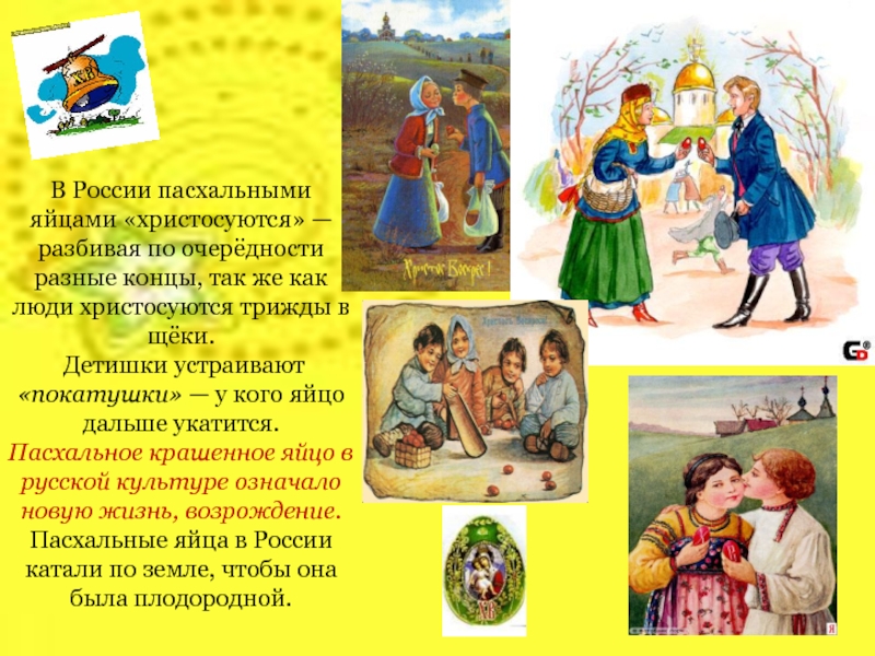 Пасхальное крашенное яйцо в русской культуре означало новую жизнь, возрождение. Пасхальные яйца в России катали по земле, чтобы она была плодородной.
