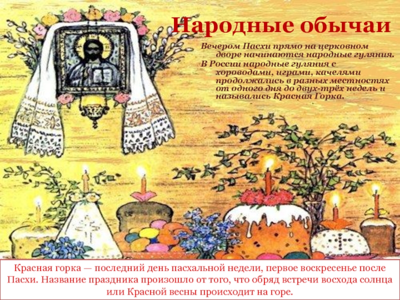 Красная горка — последний день пасхальной недели, первое воскресенье после Пасхи. Название праздника произошло от того, что обряд встречи восхода солнца или Красной весны происходит на горе.