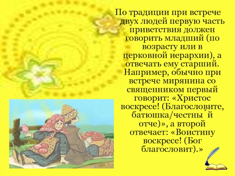 ему старший. Например, обычно при встрече мирянина со священником первый говорит: «Христос воскресе! (Благословите, батюшка/честны́й отче)», а второй отвечает: «Воистину воскресе! (Бог благословит).»