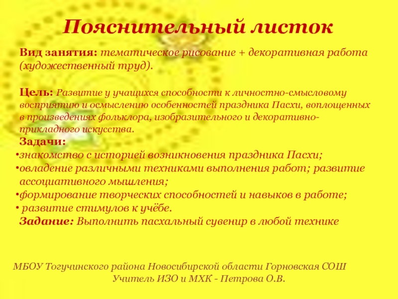 Цель: Развитие у учащихся способности к личностно-смысловому восприятию и осмыслению особенностей праздника Пасхи, воплощенных в произведениях фольклора, изобразительного и декоративно-прикладного искусства.