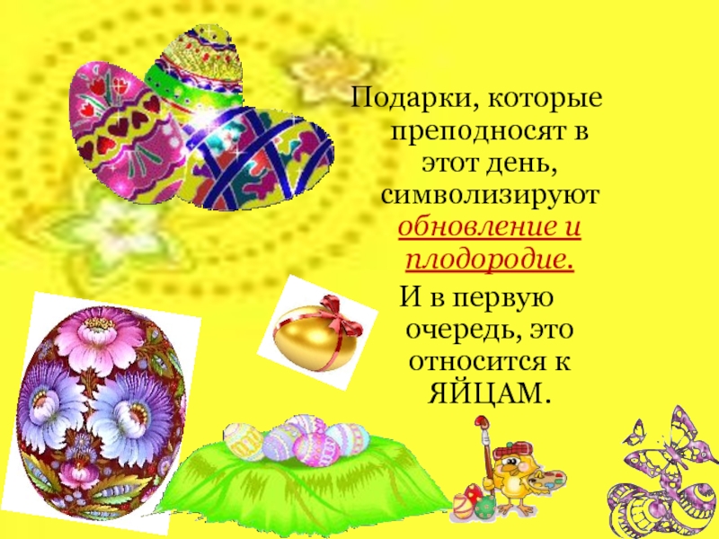 Слайд 10Подарки, которые преподносят в этот день, символизируют обновление и плодородие.