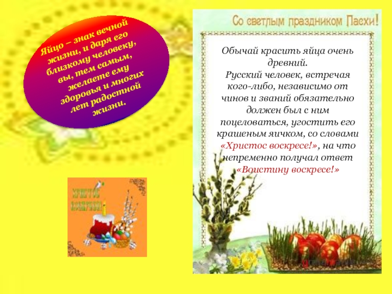 С тех пор верующие в светлый праздник Пасхи одаривают друг друга крашеными яйцами со словами «Христос Воскрес!» – «Воистину воскрес!».