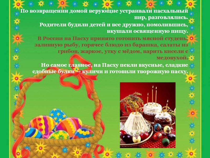 Слайд 17По возвращении домой верующие устраивали пасхальный пир, разговлялись.
