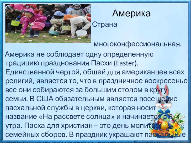 Америка не соблюдает одну определенную традицию празднования Пасхи (Easter). Единственной чертой, общей для американцев всех религий, является то, что в праздничное воскресенье все они собираются за большим столом в кругу семьи. В США обязательным является посещение пасхальной службы в церкви, которая носит название «На рассвете солнца» и начинается в 6 утра. Пасха для христиан – это день молитв и семейных сборов. В праздник украшают пасхальные корзины живыми цветами, лентами и бантами. Популярно катание яиц по газону.