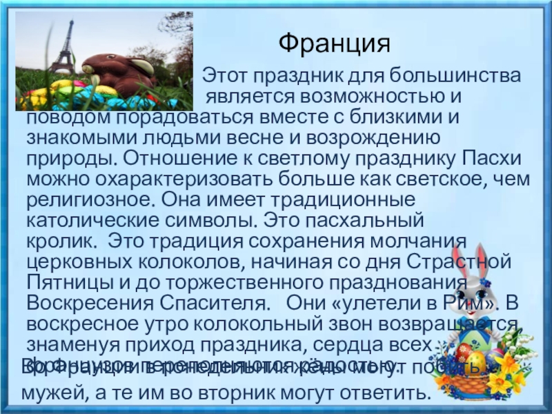Этот праздник для большинства граждан является возможностью и поводом порадоваться вместе с близкими и знакомыми людьми весне и возрождению природы. Отношение к светлому празднику Пасхи можно охарактеризовать больше как светское, чем религиозное. Она имеет традиционные католические символы. Это пасхальный кролик. Это традиция сохранения молчания церковных колоколов, начиная со дня Страстной Пятницы и до торжественного празднования Воскресения Спасителя. Они «улетели в Рим». В воскресное утро колокольный звон возвращается, знаменуя приход праздника, сердца всех французов переполняются радостью.