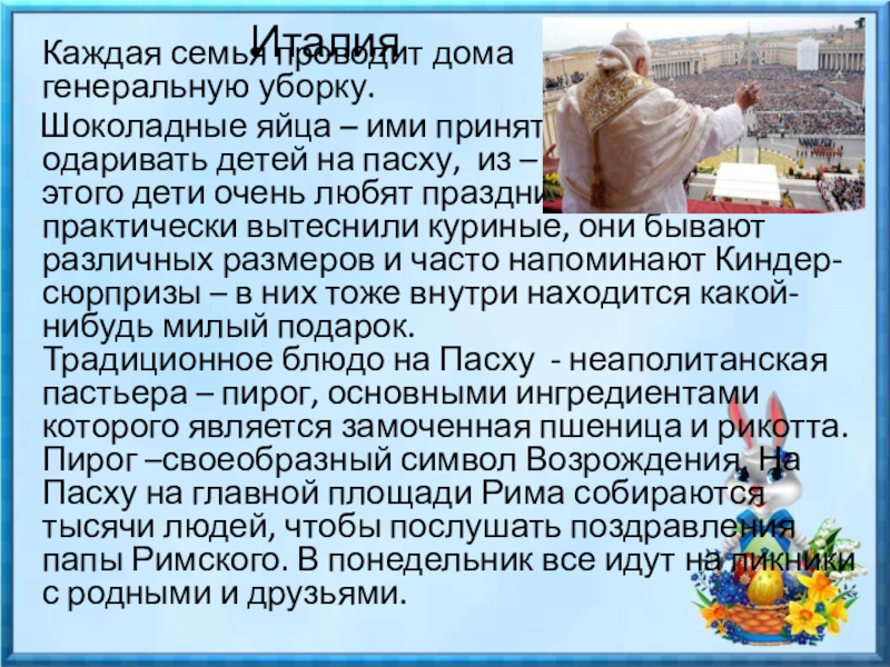 Традиционное блюдо на Пасху - неаполитанская пастьера – пирог, основными ингредиентами которого является замоченная пшеница и рикотта. Пирог –своеобразный символ Возрождения. На Пасху на главной площади Рима собираются тысячи людей, чтобы послушать поздравления папы Римского. В понедельник все идут на пикники с родными и друзьями.