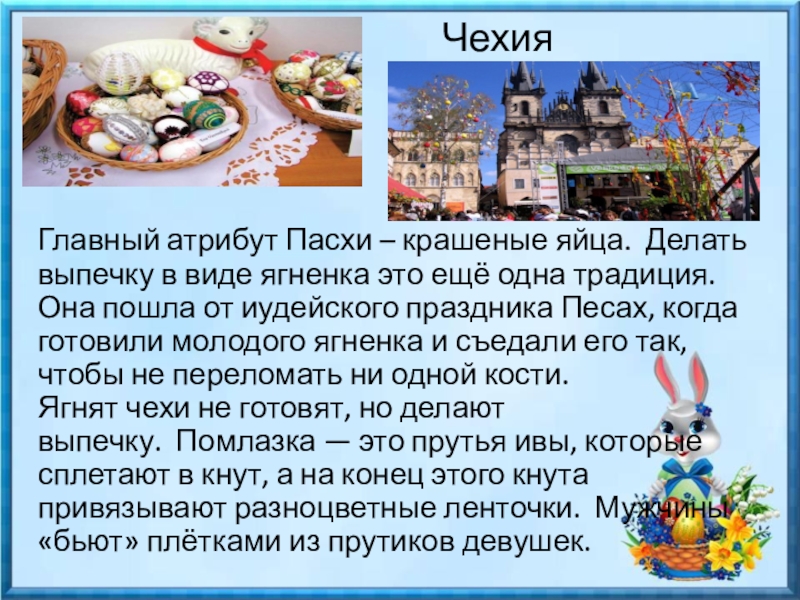 Ягнят чехи не готовят, но делают выпечку. Помлазка — это прутья ивы, которые сплетают в кнут, а на конец этого кнута привязывают разноцветные ленточки. Мужчины «бьют» плётками из прутиков девушек.