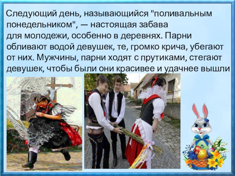 Слайд 12 Следующий день, называющийся "поливальным понедельником", — настоящая забава для молодежи,