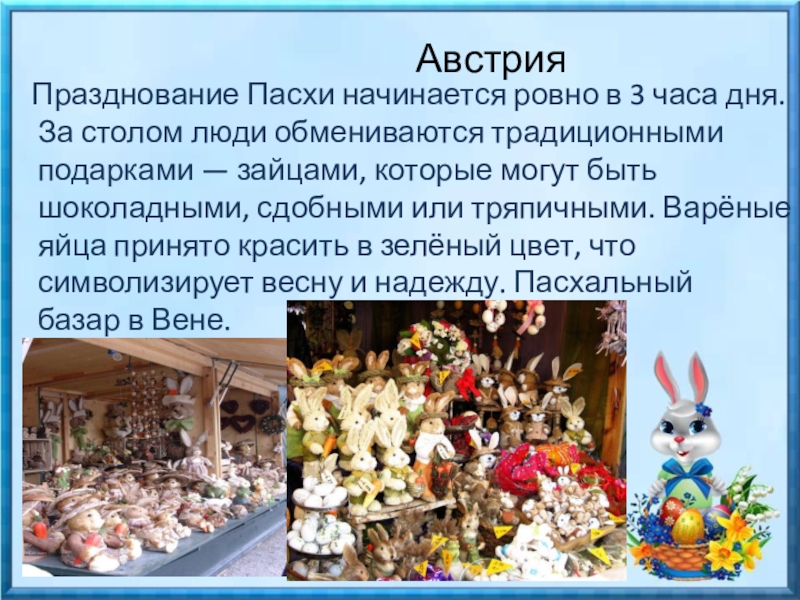 сдобными или тряпичными. Варёные яйца принято красить в зелёный цвет, что символизирует весну и надежду. Пасхальный базар в Вене.