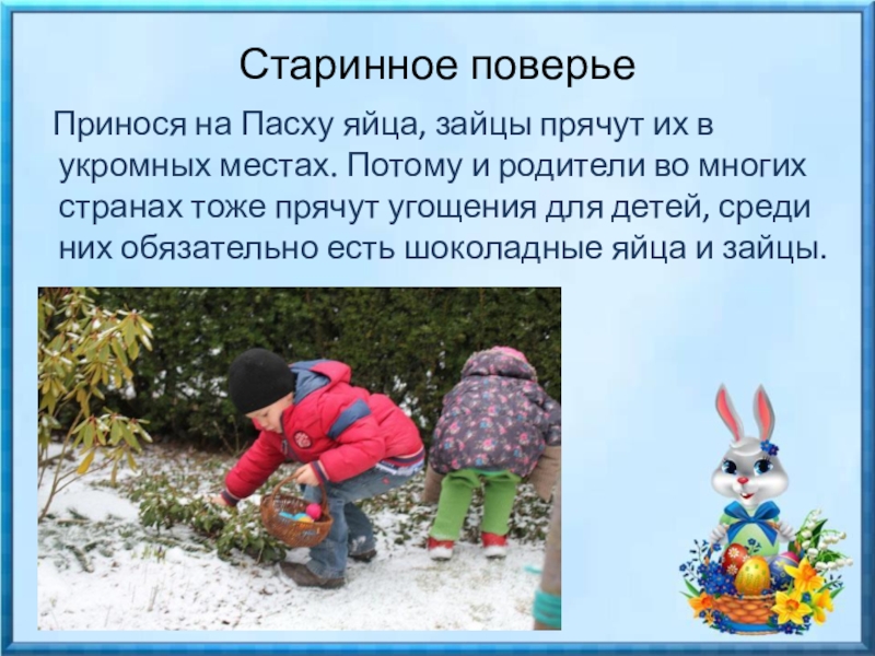 прячут угощения для детей, среди них обязательно есть шоколадные яйца и зайцы.