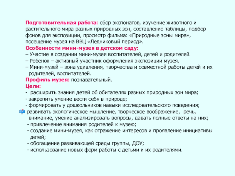 Слайд 2Подготовительная работа: сбор экспонатов, изучение животного и растительного мира разных