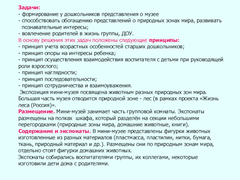 Содержание и экспонаты. В мини-музее представлены фигурки животных изготовленные из разных материалов (пластмасса, пластилин, нитки, бумага, ткань, природный материал и др.). Размещены они по природным зонам мира, отдельно стоят фигурки домашних животных.