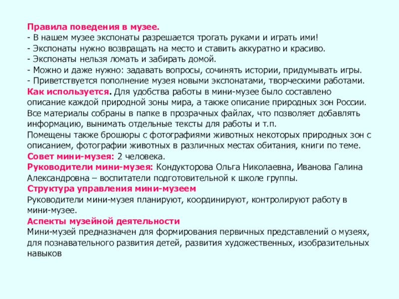 Руководители мини-музея: Кондукторова Ольга Николаевна, Иванова Галина Александровна – воспитатели подготовительной к школе группы.