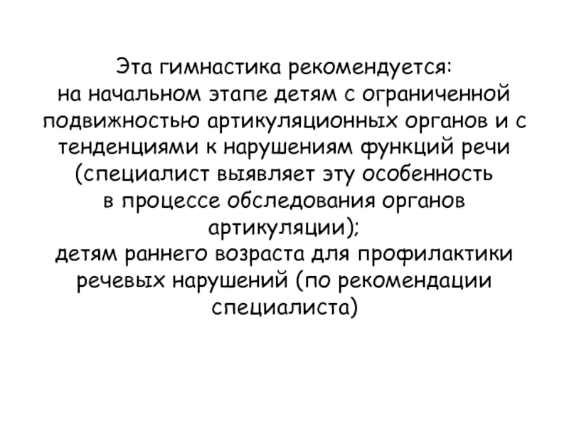 Слайд 2Эта гимнастика рекомендуется: на начальном этапе детям с ограниченной подвижностью артикуляционных