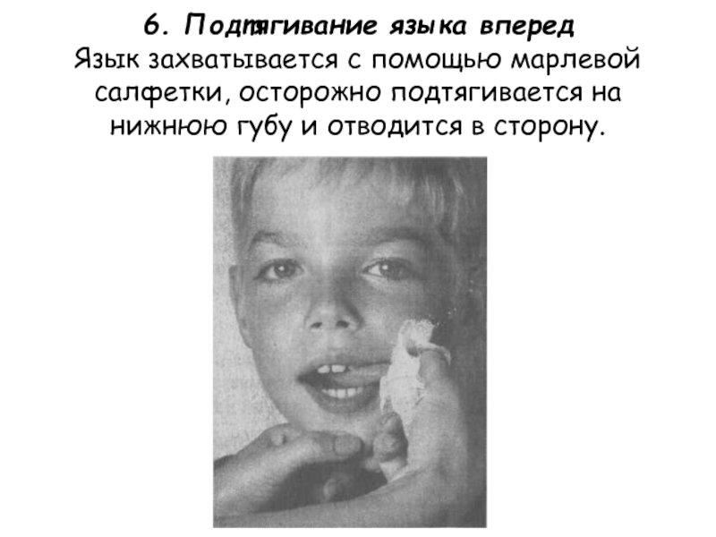 6. Подтягивание языка вперед Язык захватывается с помощью марлевой салфетки, осторожно подтягивается на нижнюю губу и отводится