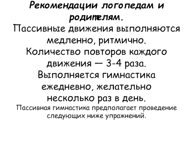 Слайд 3Рекомендации логопедам и родителям. Пассивные движения выполняются медленно, ритмично. Количество повторов каждого