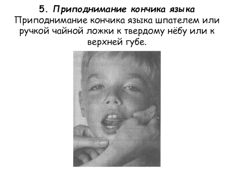 5. Приподнимание кончика языка Приподнимание кончика языка шпателем или ручкой чайной ложки к твердому нёбу или к