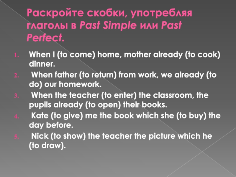 Раскройте скобки, употребляя глаголы в Past Simple или Past Perfect.When I (to come) home, mother already (to