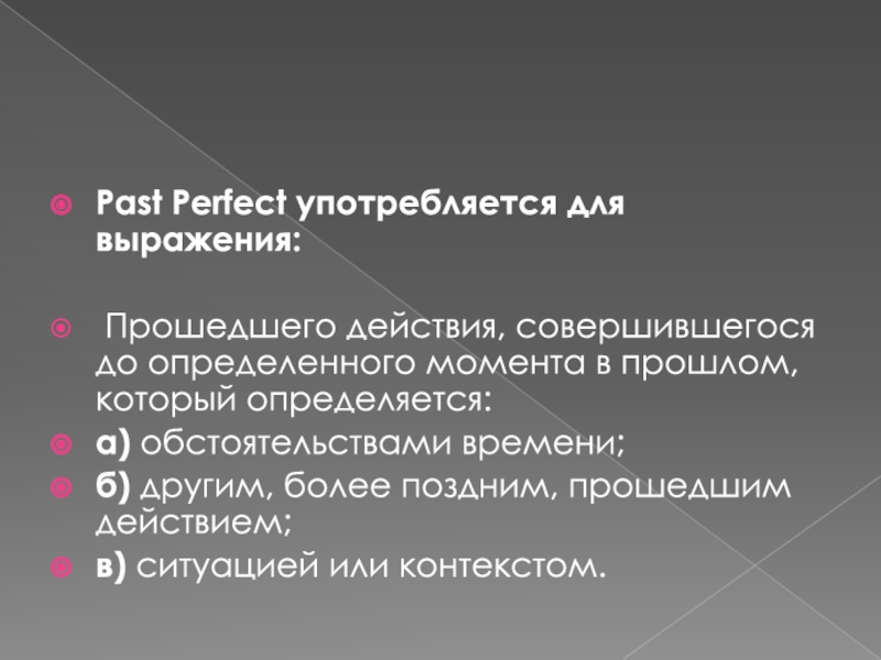 Past Perfect употребляется для выражения: Прошедшего действия, совершившегося до определенного момента в прошлом, который определяется:а) обстоятельствами времени;б) другим, более поздним, прошедшим действием; в) ситуацией или контекстом.