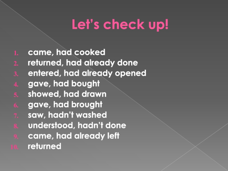 Let’s check up!came, had cookedreturned, had already doneentered, had already openedgave, had boughtshowed, had drawngave, had broughtsaw,