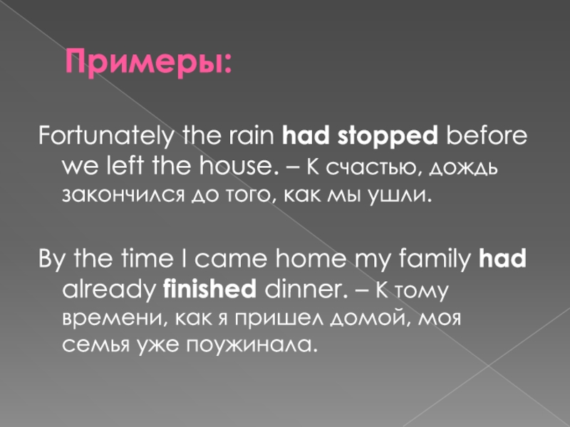 Примеры:Fortunately the rain had stopped before we left the house. – К счастью, дождь закончился до того,