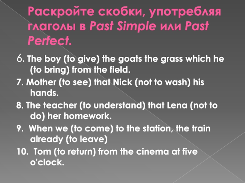 Раскройте скобки, употребляя глаголы в Past Simple или Past Perfect.6. The boy (to give) the goats the