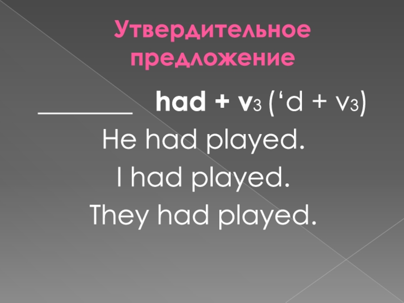 Утвердительное предложение_______  had + v3 (‘d + v3)He had played.I had played.They had played.
