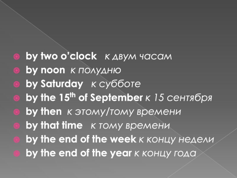 by two o’clock   к двум часамby noon  к полуднюby Saturday   к субботеby the 15th of September к