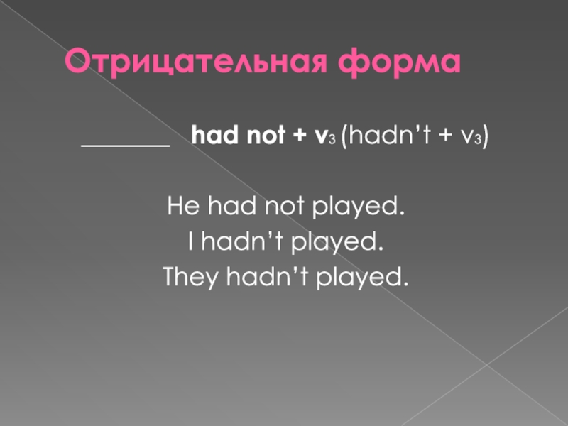 Отрицательная форма_______  had not + v3 (hadn’t + v3)He had not played.I hadn’t played.They hadn’t played.