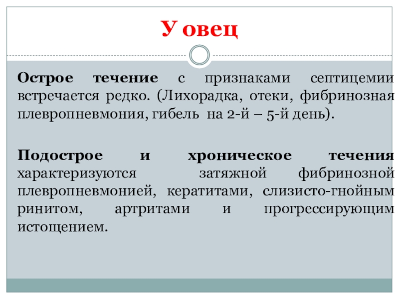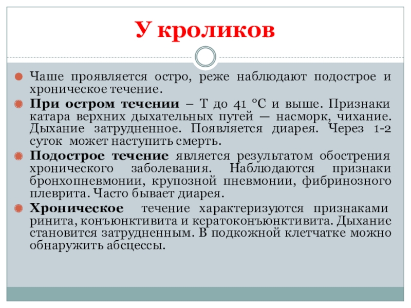 При подостром выступают признаки фибринозной пневмонии: кашель, одышка и слизисто-гнойный ринит, смерть на 5-8-й день.