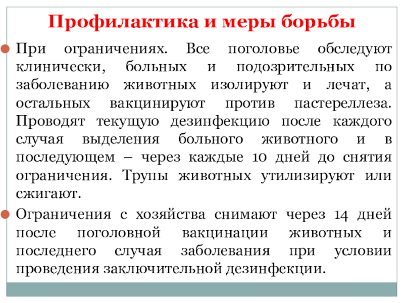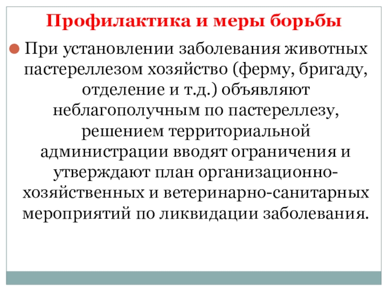 Слайд 42При установлении заболевания животных пастереллезом хозяйство (ферму, бригаду, отделение и