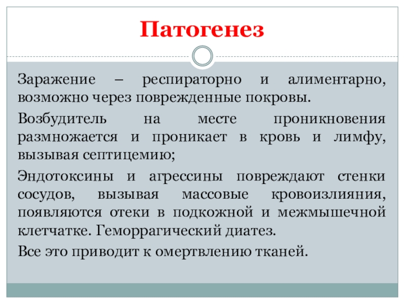 Заражение – респираторно и алиментарно, возможно через поврежденные покровы.