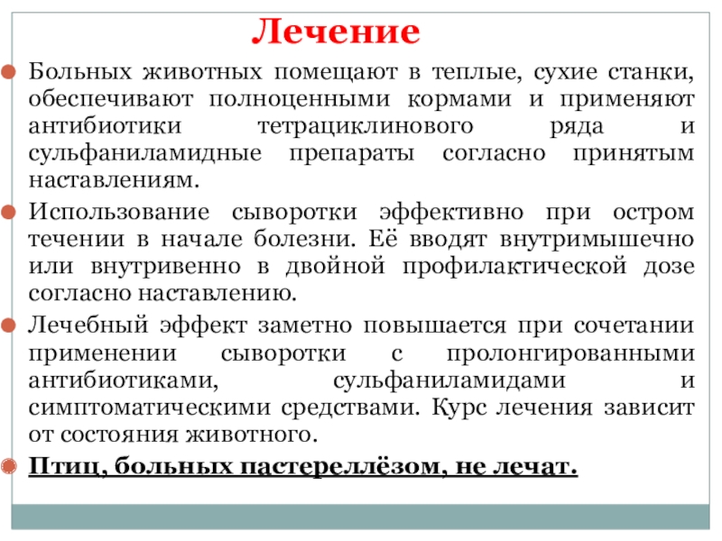 заболеванию животных изолируют и лечат, а остальных вакцинируют против пастереллеза.
