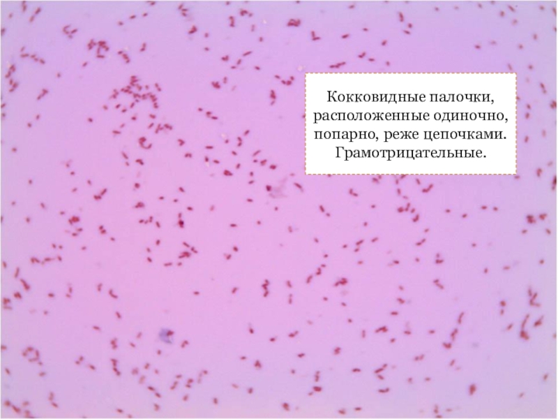 Слайд 7Кокковидные палочки, расположенные одиночно, попарно, реже цепочками.