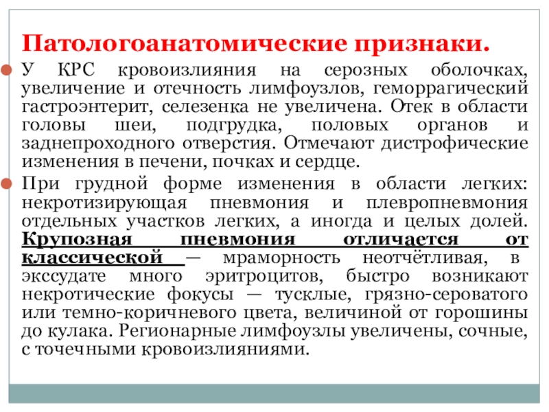 У свиней при остром обнаруживают многочисленные кровоизлияния на коже, серозных и слизистых оболочках, студенисто-серозный отек подкожной клетчатки в области гортани и шеи, отек легких, увеличение и гиперемию лимфатических узлов.