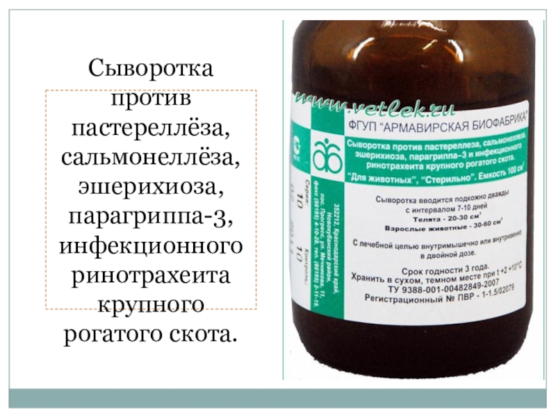 Слайд 40Сыворотка против пастереллёза, сальмонеллёза, эшерихиоза, парагриппа-3, инфекционного ринотрахеита крупного рогатого