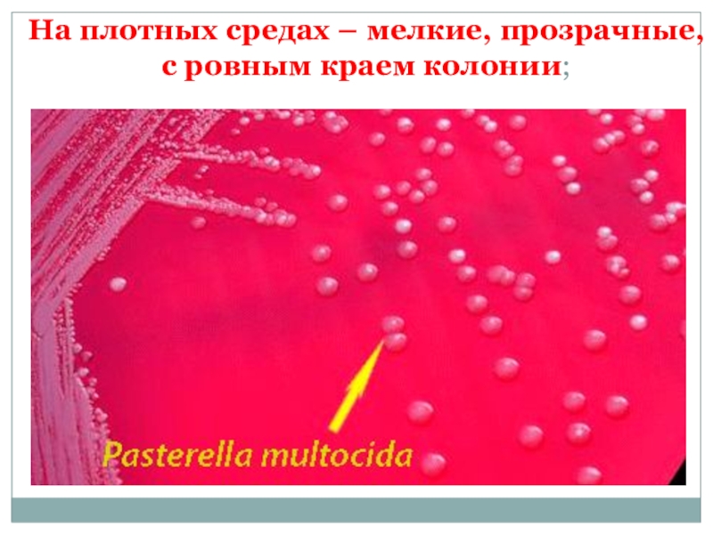 Слайд 9На плотных средах – мелкие, прозрачные, с ровным краем колонии;