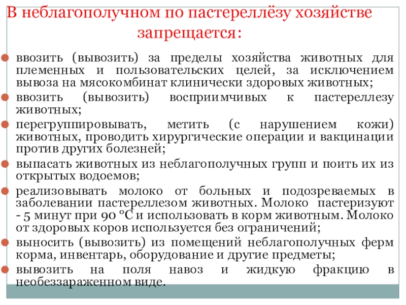 Слайд 44В неблагополучном по пастереллёзу хозяйстве запрещается: