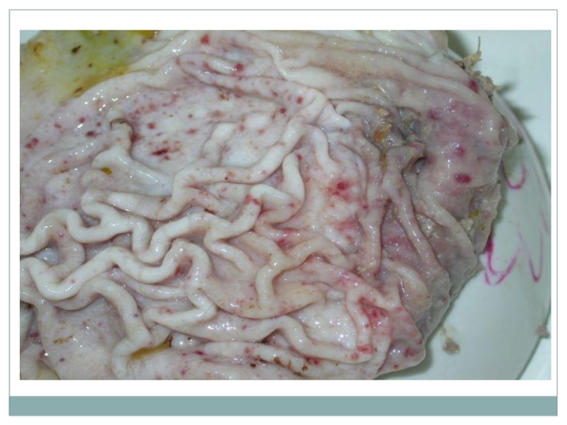слизистой и серозной оболочках кишечника. Особенно характерными считаются полосчатые кровоизлияния между кольцами трахеи.