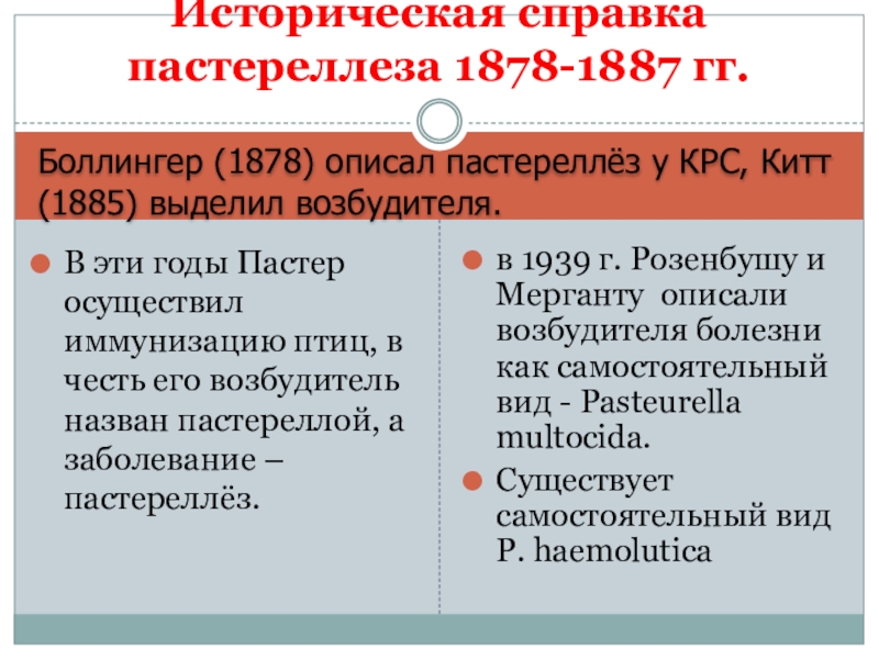 Слайд 2Боллингер (1878) описал пастереллёз у КРС, Китт (1885) выделил возбудителя.