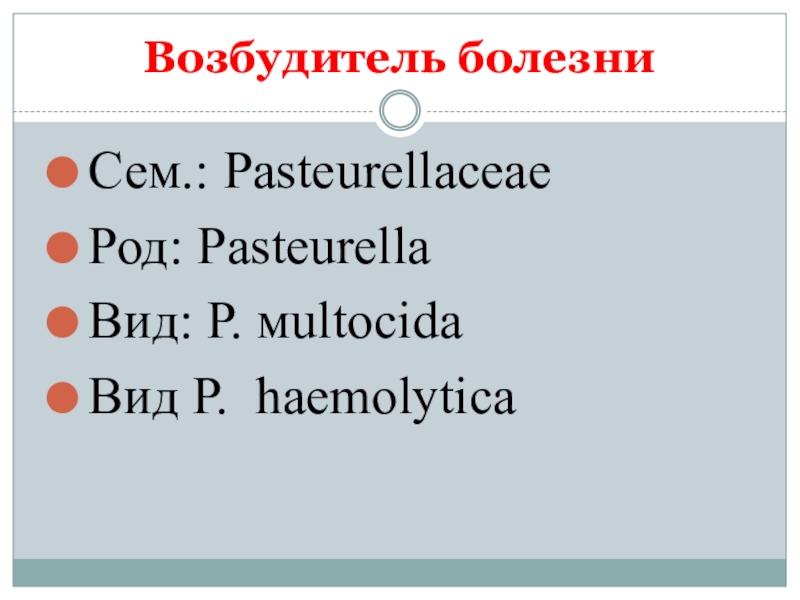в 1939 г. Розенбушу и Мерганту описали возбудителя болезни как самостоятельный вид - Pasteurella multocida.
