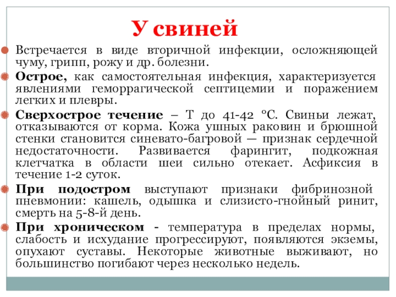 Подострое течение является результатом обострения хронического заболевания. Наблюдаются признаки бронхопневмонии, крупозной пневмонии, фибринозного плеврита. Часто бывает диарея.