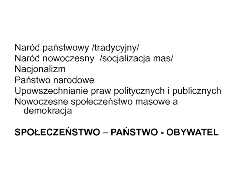 Naród państwowy /tradycyjny/Naród nowoczesny /socjalizacja mas/Nacjonalizm Państwo narodoweUpowszechnianie praw politycznych i publicznychNowoczesne społeczeństwo masowe a demokracjaSPOŁECZEŃSTWO –