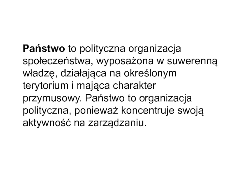 Państwo to polityczna organizacja społeczeństwa, wyposażona w suwerenną władzę, działająca na określonym terytorium i mająca